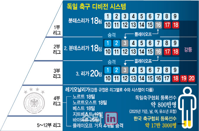 독일은 3부리그부터 프로로 인정한다. 이후 각 지역 단위로 리그가 분화된다. 시즌을 마치면 리그별 우승 및 하위팀이 상하 리그로 오르내린다. 이런 개방성은 승강제의 심장이다. 아무리 작은 구단이라도 긴장과 희망을 불어넣는다. 선수들은 더 높은 목표를 바라보고 꿈을 이루기 위해 사력을 다한다.