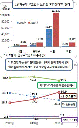 노인들 스스로가 향후 혼자 살기 어려운 상황에도 자녀와 함께 사는 것 보다 실버타운 등 노인전용공간을 희망하는 경우도 점차 늘어나고 있다.