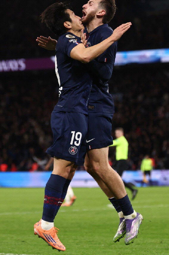 | | PSG 이강인(왼쪽)이 결승골을 넣은 곤살로 하무스와 함께 몸을 부딪히며 기뻐하고 있다. 사진=AFPBBNews |
