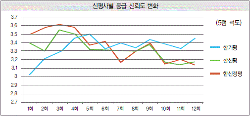 한기평이 1등을 놓치지 않는 이유에 대한 시장 참여자들의 생각은 대체로 비슷했다. 평가사로서 기본에 충실하다는 것. 즉, 평가 보고서의 충실함이 자연스럽게 등급 신뢰도 상승으로 이어졌다는 설명이다. 설문 결과의 수치를 통해서도 확인된다. 한기평은 `보고서 만족도` 부문에서 총 3.67점으로 응답자들의 가장 높은 지지를 얻었다. 특히 한기평은 8회차 이후 매회 점수가 올라가고 있는 반면 가장 낮은 점수를 받은 한신평의 경우 회를 거듭할수록 점수가 오히려 떨어지고 있다. 또 한신정평은 점수가 비교적 많이 올랐지만 직전회 최악의 성적이었다는 점을 감안하면 기저효과라는 해석이 나오고 있다.