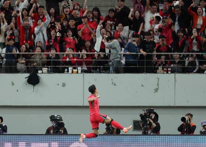 | | 14일 서울 마포구 서울월드컵경기장에서 열린 한국과 파라과이 축구 대표팀의 친선경기. 엄지성이 골을 넣고 세리머니하고 있다. 사진=연합뉴스 |