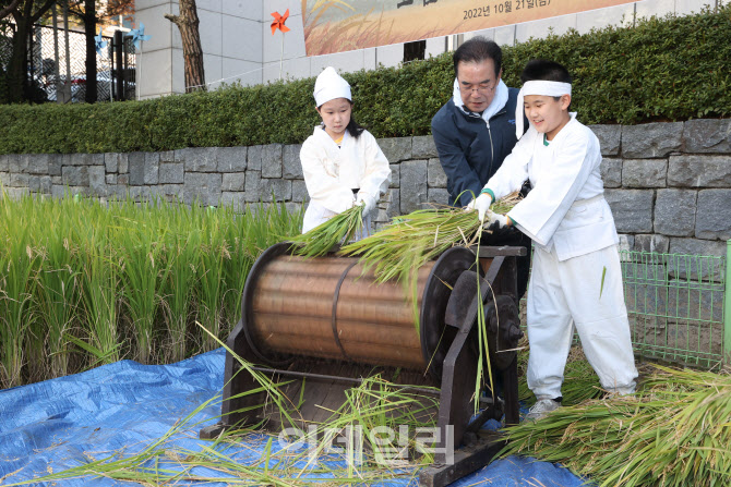 [이데일리 김태형 기자] 이성희 농협중앙회장이 21일 서울 중구 농업박물관 체험농장에서 열린 '도심 속 전통 벼베기 행사'에서 서울미동초등학교 학생들과 함께 수확한 벼를 탈곡하고 있다.