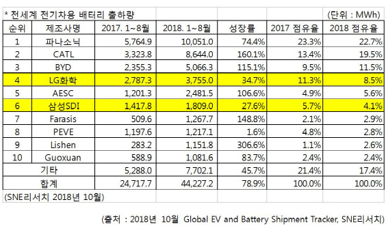 하지만 LG화학과 삼성SDI는 중국계와 일본계의 강력한 공세에 계속 순위와 점유율이 내려가면서 고전 중이다. 업계 관계자는 “앞으로 이러한 상황을 근본적으로 타개할 활로를 마련하는 것이 시급한 실정”이라면서 “배터리 시장도 치킨게임 끝에 소수의 업체만 살아남게 될 것”이라고 말했다.