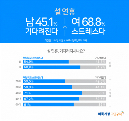 벼룩시장구인구직이 직장인 1154명을 대상으로 설 명절에 대한 설문조사를 진행한 결과 직장인 62.8%는 다가오는 설 연휴가 ‘부담되고 스트레스다’고 답했다. ‘기다려진다’고 응답한 사람은 37.2%에 불과했다.