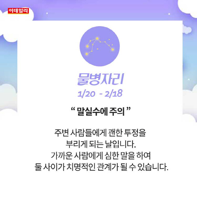 △물병자리 : 주변 사람들에게 괜한 투정을 부리게 되는 날입니다. 둘이 있을 때는 모르지만 여러 사람이 있을 때 가까운 사람에게 심한 말을 하여 둘 사이가 치명적인 관계가 되 버릴 수 있습니다.