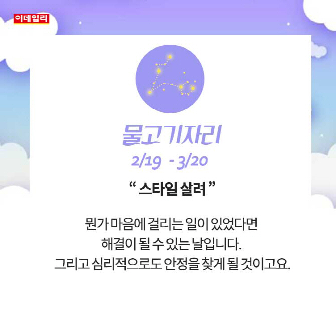 △물고기자리 : 뭔가 마음에 걸리는 일이 있었다면 해결이 될 수 있는 날입니다. 그리고 심리적으로도 안정을 찾게 될 것이고요. 이러한 안정 덕분에 자기 자신에게 좀더 많은 시간을 쓰게 될 수 있는 날이기도 합니다.