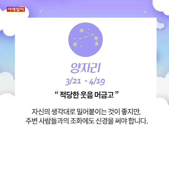 △양자리 : 자신의 생각대로 밀어붙이는 것이 좋지만, 주변 사람들과의 조화에도 신경을 써야 합니다. 윗사람과 약간의 트러블이 있을 수 있는데 적당히 웃어넘기는 것이 제일 편한 방법입니다.