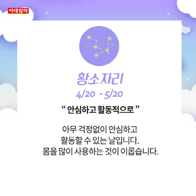 △황소자리 : 아무 걱정없이 안심하고 활동할 수 있는 날입니다. 몸을 많이 사용하는 것이 이롭습니다. 가벼운 운동도 좋고 오전을 이용해 자전거를 타거나 등산을 해보는 것도 나쁘지 않습니다.