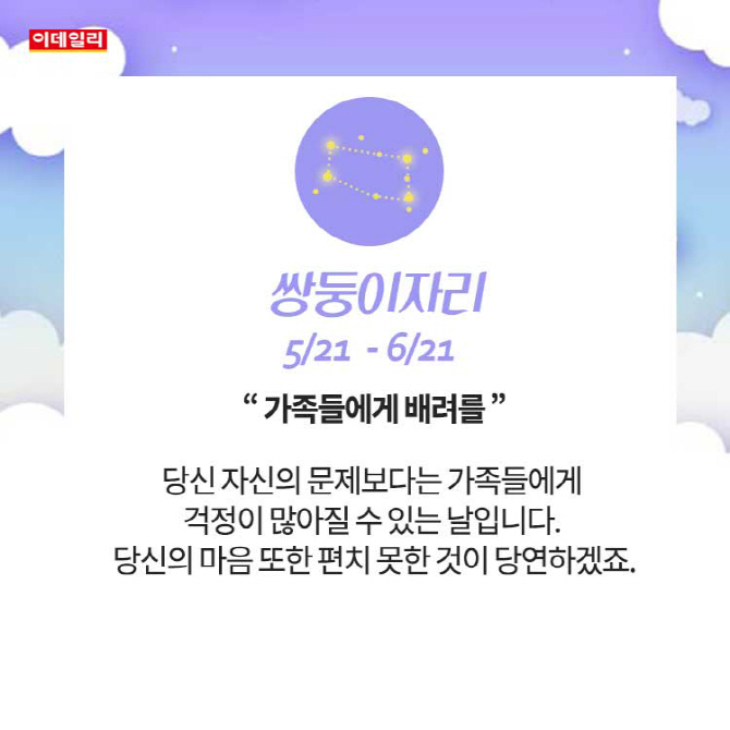 △쌍둥이자리 : 당신 자신의 문제보다는 가족들에게 걱정이 많아질 수 있는 날입니다. 그러니 당신의 마음 또한 편치 못한 것이 당연하겠죠. 가족 구성원들에게 관심을 갖고 지켜봐야 할 필요가 있는 때입니다.