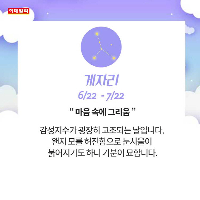 △게자리 : 감성지수가 굉장히 고조되는 날입니다. 오래전 사랑하던 이에 대한 생각으로 가득할 수도 있고, 왠지 모를 허전함으로 눈시울이 붉어지기도 하니 기분이 묘합니다.