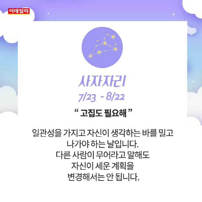 △사자자리 : 일관성을 가지고 자신이 생각하는 바를 밀고 나가야 하는 날입니다. 다른 사람이 무어라고 말해도 자신이 세운 계획을 변경해서는 안 됩니다. 아무리 귀가 얇아도 오늘만은 당신의 생각을 바꾸지 마세요.