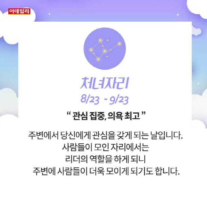 △처녀자리 : 주변에서 당신에게 관심을 갖게 되는 날입니다. 사람들이 모인 자리에서는 당신의 의견이 제대로 먹히게 되고, 리더의 역할을 하게 되니 주변에 사람들이 더욱 모이게 되기도 합니다.