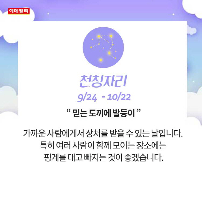 △천칭자리 : 가까운 사람에게서 상처를 받을 수 있는 날입니다. 특히 여러 사람이 함께 모이는 장소에는 핑계를 대고 빠지는 것이 좋겠습니다. 자칫 잘못하면 자존심에 심한 상처를 받을 수 있습니다.