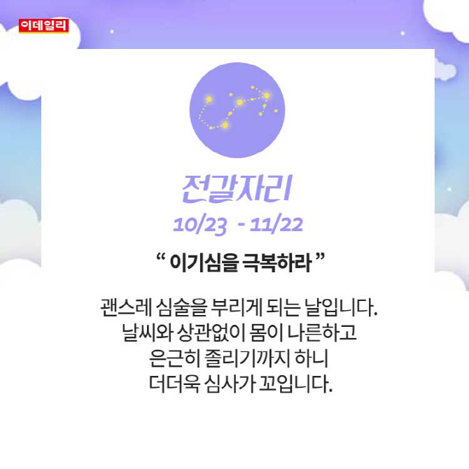 △전갈자리 : 괜스레 심술을 부리게 되는 날입니다. 날씨와 상관없이 몸이 나른하고 은근히 졸리기까지 하니 더더욱 심사가 꼬입니다. 일단 내 몸과 마음이 편안하고 보자는 이기심도 생기게 되고요.