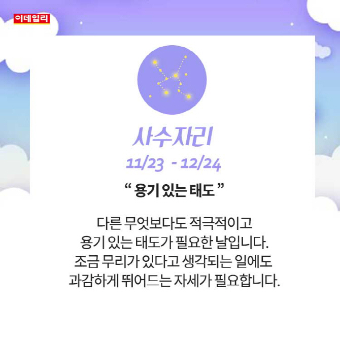△사수자리 : 다른 무엇보다도 적극적이고 용기 있는 태도가 필요한 날입니다. 자신이 생각하기에 조금 무리가 있다고 생각되는 일에도 과감하게 뛰어드는 자세가 필요합니다. 자꾸 뒤로 빼면 아무 것도 할 수 없습니다.