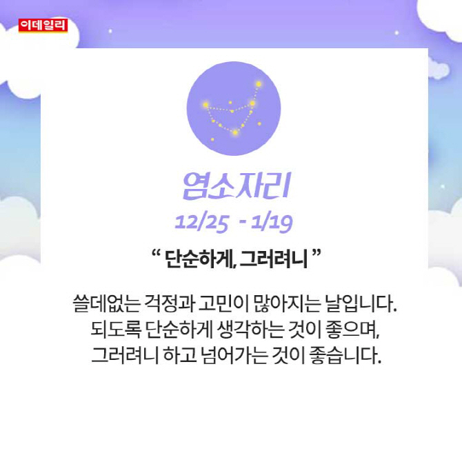 △염소자리 : 쓸데없는 걱정과 고민이 많아지는 날입니다. 되도록 단순하게 생각하는 것이 좋으며, 그러려니 하고 넘어가는 것이 좋습니다. 뾰족한 해결책이 나오는 날이 아니니까요.