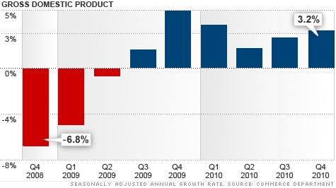 28일(현지시간) 미 상무부는 2010년 4분기 국내총생산(GDP)이 전분기 대비 3.2% 증가했다고 발표했다. 이는 3분기의 2.6%보다 높은 성장률이다. 다만 블룸버그통신 등이 집계한 월가 이코노미스트들의 예상치인 3.5%에는 다소 못미쳤다.