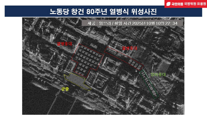 11일 국회 국방위원회 소속 국민의힘 유용원 의원이 미국 초소형 SAR(합성개구레이더) 위성업체 ‘엄브라(Umbra)’로부터 입수한 위성사진(10일 오후 10시 1분 및 10시 34분 촬영)에 따르면, 김일성광장에는 병력 및 군중 수만 명이 밀집해 있었다. 사진에는 열병종대가 진입하는 장면과 함께 대형 ICBM으로 추정되는 이동식 발사대들이 대기 중인 모습이 식별됐다.