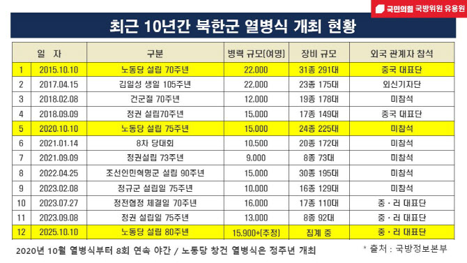 북한은 2020년 노동당 창건 75주년 이후 최근 7차례의 열병식을 모두 야간 또는 심야에 개최했다. 조명 연출로 최신 무기의 위용을 강조하고 결함은 감추는 선전 효과를 극대화하기 위한 의도다.