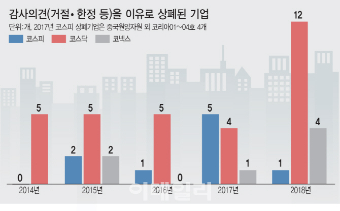 연도별로 보면 △2014년 5곳 △2015년 9곳 △2016년 6곳 △2017년 10곳 △2018년 17곳으로, 감사의견 비적정으로 상장폐지된 기업이 올해 특히 늘었다.