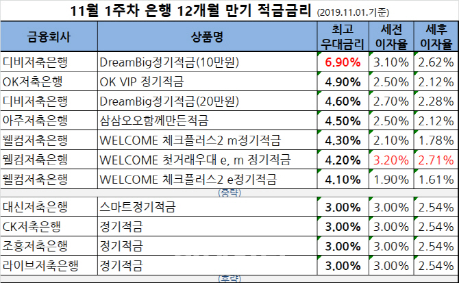 [이데일리 김범준 기자] 11월 저축은행 1년 만기 적금 최고 우대금리는 지난주와 같은 연 6.9%, 최고 기본금리는 연 3.2%로 시작했다.