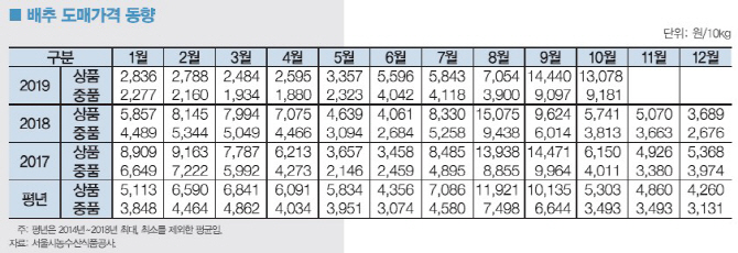 지난달 배추 가락시장 도매가격은 준고랭지 2기작과 가을배추 출하량 감소로 전년(5740원)과 평년(5300원)보다 높은 1만3080원이었다. 지난달 상순에는 1만6390원까지 올랐다가 하순에 9600원으로 하락했다.
