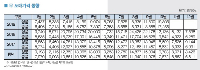 이달 무 가격도 전년(6130원)과 평년(8070원)보다 상승한 20kg당 2만원 내외로 전망했다. 지난달 무 20kg당 도매가격은 전년(1만2140원)과 평년(9700원)보다 높은 1만9810원이었다. 이는 가을 무 출하량이 적은데다 태풍 피해로 공급량 부족이 예상되면서 준고랭지2기작 무에 대한 저장 수요가 증가했기 때문이다.