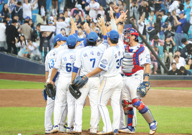 | | 7일 대구 삼성라이온즈파크에서 열린 2025 KBO 포스트시즌 와일드카드 2차전 삼성 라이온즈와 NC 다이노스의 경기. 삼성 선수들이 승리한 뒤 기뻐하고 있다. 사진=연합뉴스 |