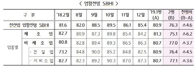 비제조업에서는 건설업(80.9→76.4)과 서비스업(80.7→77.1)이 대폭 하락했다. ‘숙박 및 음식점업’(73.5→67.3)과 ‘운수업’(79.6→73.6) 등 6개 업종도 하락했다. 전체산업을 보면 내수판매전망(79.8→75.5)과 수출전망(88.3→79.8), 영업이익전망(78.2→74.6), 자금사정전망(78.0→74.0) 등 모든 항목이 줄었다.