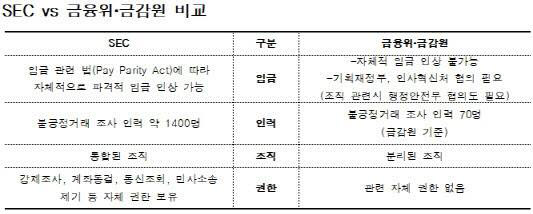 물론 강력한 법 집행은 제도만으로 되는 것이 아닙니다. 주가조작 등 증권범죄를 포착·조사·처벌하는 조직이 탄탄해야 하고 인력·예산 지원도 충분해야 합니다. 미 SEC는 증권범죄 관련해 강제조사권, 통신조회, 계좌추적 등 막강한 권한을 갖고 있습니다. 금융범죄 특성을 고려해 범죄자를 신속 처리하는 게 필요하기 때문입니다. 이는 이같은 권한이 사실상 없는 우리나라 금융위, 금감원과 다른 현실입니다.