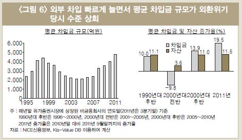 15일 LG경제연구원에 따르면 국내 상장기업의 평균 차입금 규모는 지난해 9월말 기준 4780억원으로 외환위기 발생 당시인 1998년말 4405억원을 웃돈다. 2005년 저점을 기록했던 2145억원에 비해 두배 이상 늘어난 것이다.