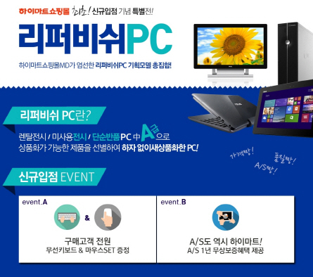 특히 하이마트 쇼핑몰은 리퍼비시 PC 입점 기념으로 리퍼브 제품 구매고객 전원에게 무선 키보드·마우스 세트를 사은품으로 증정하며 최대 1년간의 무상AS 보증혜택을 제공한다. 리퍼브 제품의 AS기간은 통상 3~6개월 정도지만 이번에는 구매 후 1년까지 무상 AS를 제공하기로 했다.