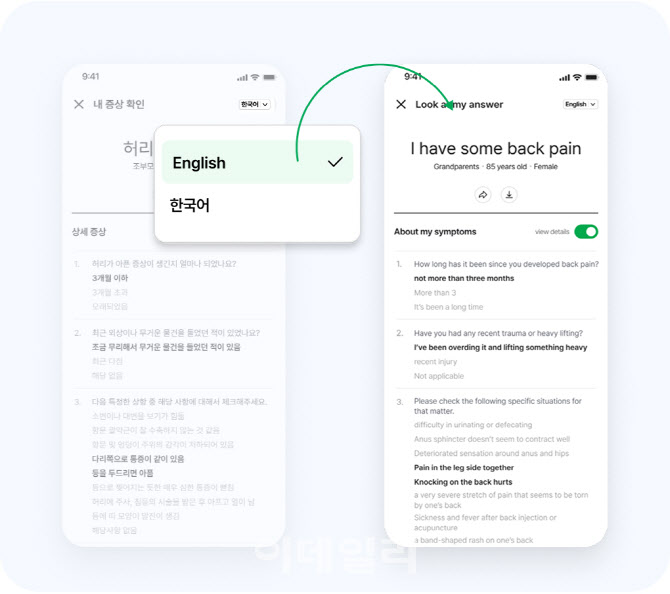 한국어, 영어 중 본인이 편한 언어로 설정해 증상체크를 수행한 후 간편하고 정확하게 번역을 제공해 의료진에게 전달할 수 있다.