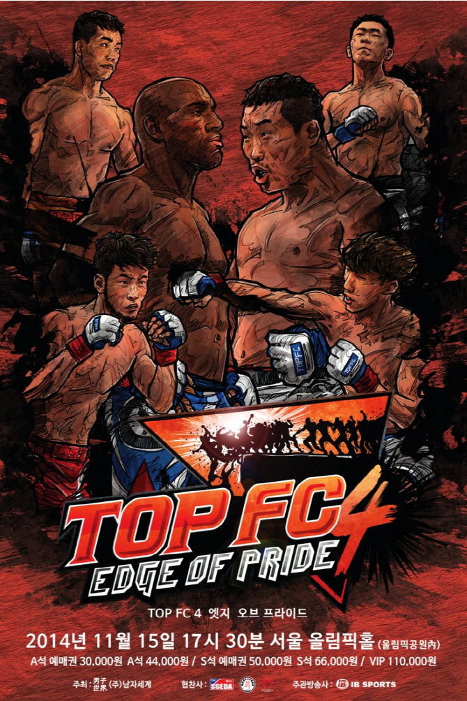 TOP FC4 ‘Edge of Pride’는 오는 15일 오후 5시30분부터 올림픽홀에서 개최되며 IB스포츠를 통해 SkyLife 채널49에서 오후 7시30분 메인 매치부터 생방송 될 예정이다.