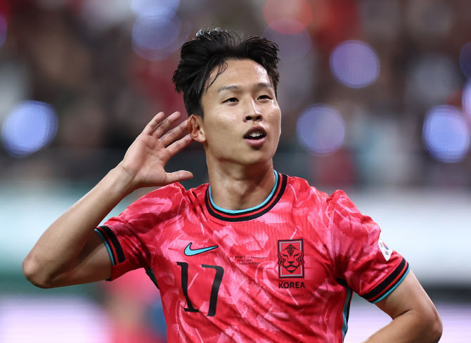 | | 14일 서울 마포구 서울월드컵경기장에서 열린 한국과 파라과이 축구 대표팀의 친선경기. 엄지성이 골을 넣고 세리머니하고 있다. 사진=연합뉴스 |