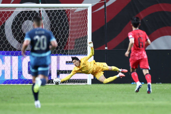 | | 14일 서울 마포구 서울월드컵경기장에서 열린 한국과 파라과이 축구 대표팀의 친선경기. 김승규가 파라과이 로날도 마르티네스의 슈팅을 막아내고 있다. 사진=연합뉴스 |