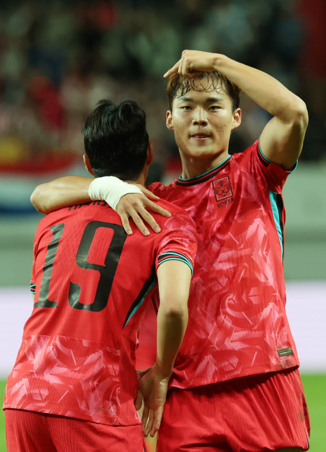 | | 14일 서울 마포구 서울월드컵경기장에서 열린 한국과 파라과이 축구 대표팀의 친선경기. 엄지성이 선제골을 넣은 뒤 손흥민과 함께 기뻐하고 있다. 사진=연합뉴스 |