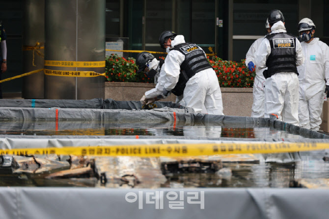 | | 지난달 30일 오전 대전 유성구 국가정보자원관리원(국정자원) 화재 현장에서 감식 관계자들이 불이 붙었던 무정전·전원 장치(UPS)용 리튬이온배터리의 상태를 살피고 있다. (사진=연합뉴스) |