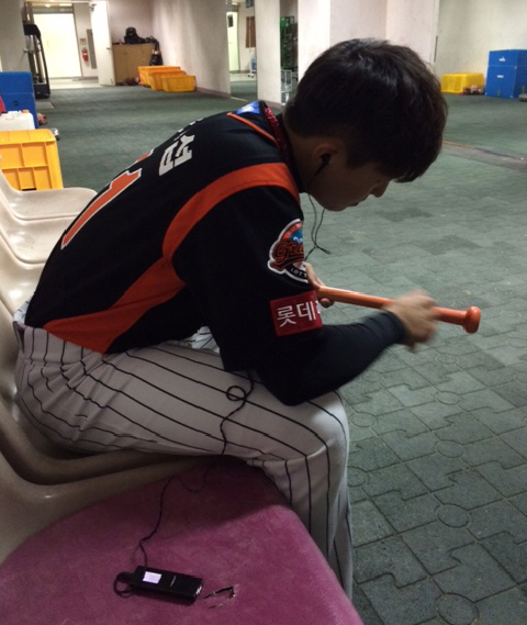 귀에는 이어폰을 꽂고, MP3에 담겨진 노래를 듣기 시작한다. 그러면서 방망이를 잡고는 그립 부분을 칼로 깎아낸다. 세심한 손동작이 한동안 계속됐다.