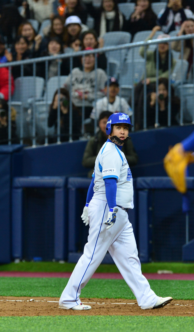 (서울=뉴스1) 6일 오후 서울 구로구 고척스카이돔에서 열린 '2015 희망더하기 자선 야구대회' 양신팀과 종범신팀의 경기에서 5회초 무사, 양신팀 유희관이 수염을 붙이고 테임즈 흉내를 내며 안타를 치고 있다. 양준혁 야구재단에서 주관하는 '2015 희망더하기 자선 야구대회'는 사회 취약계층인 멘토리 야구단을 돕기 위해 매년 12월에 진행되는 친선 경기로 전현직 야구 올스타와 다방면에서 활동 중인 방송인들이 참가한 가운데 이종범이 이끄는 '종범신팀'과 양준혁이 이끄는 '양신팀'으로 나뉘어 경기를 펼친다.