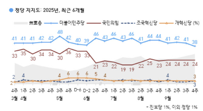 26일 한국갤럽이 이달 23~25일 전국 만 18세 이상 1002명을 대상으로 조사한 결과, 정당 지지도는 더불어민주당 38%, 국민의힘 24%, 조국혁신당·개혁신당 각각 3%, 진보당 1%였습니다. 무당층은 30%로 집계됐습니다. 민주당은 8월 셋째 주 44%에서 38%로 떨어졌지만, 국민의힘은 평균 24%로 큰 변화가 없었습니다. 민주당을 떠난 유권자가 국민의힘을 선택하지 않고 있는 겁니다.