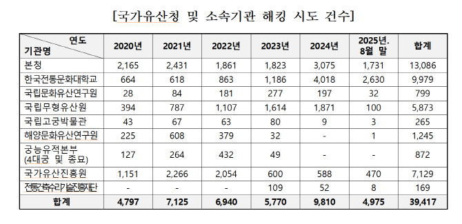 국회 문화체육관광위원회 소속 국민의힘 김승수 의원(대구 북구을)이 국가유산청으로부터 제출받은 자료에 따르면, 2020년부터 2025년 8월 말까지 누적 해킹 시도 건수는 약 3만 9417건으로 집계됐다.