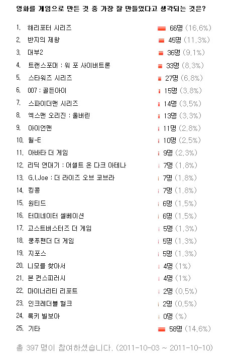 게임 커뮤니티사이트 `디시게임`(www.dcgame.in)'이 지난 3일부터 10일까지 “영화를 게임으로 만든 것 중 가장 잘 만들었다고 생각되는 것은?”이라는 주제로 설문조사를 한 결과 `해리포터 시리즈`가 1위를 차지했다.