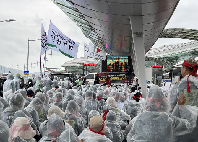 민주노총 공공운수노조 인천공항지역지부는 11일 오전 인천국제공항 제1터미널에서 결의대회를 열고 파업 조합원의 현장 복귀 및 간부파업 전환 방침을 밝혔다. 지난 1일 총파업에 돌입한 지 열흘 만이다.