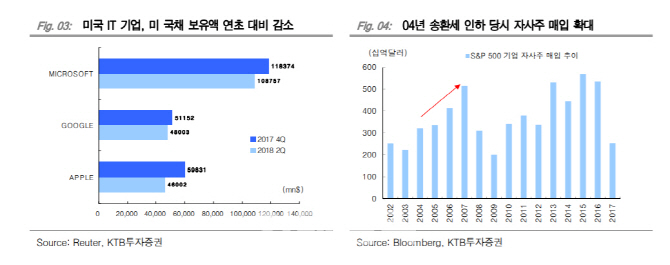 이재선 KTB투자증권 연구원은 보고서에서 “미국 IT기업들이 세재개편안 혜택으로 현금성 자산 송환이 본격적으로 진행되고 있다”며 “이는 미국 증시의 추가 상승 요인을 지지해주는 재료로 작용할 전망”이라고 밝혔다.