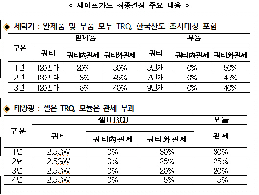 이번 세이프가드 발동으로 삼성 LG 등 가전업체와 태양광업체의 피해가 불가피할 것으로 보인다. 삼성과 LG전자를 비롯한 수입산 가정용 세탁기에 대해서는 TRQ(저율관세할당) 기준을 120만대로 설정하고, 첫해에는 120만대 이하 물량에 대해선 20%, 이를 초과하는 물량에는 50%의 관세를 부과하도록 했다.