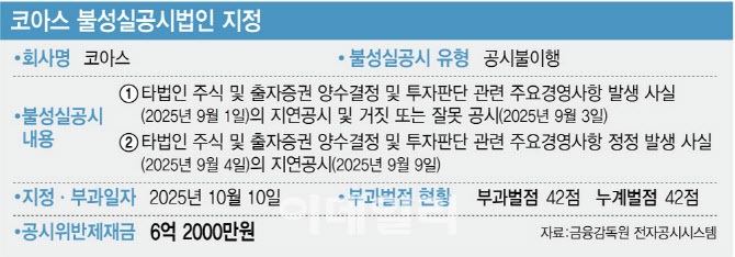 지난 2022년 비케이탑스가 공시불이행으로 벌점 50점·제재금 5억원을 부과받은 이후로 가장 강력한 조치로 평가된다.