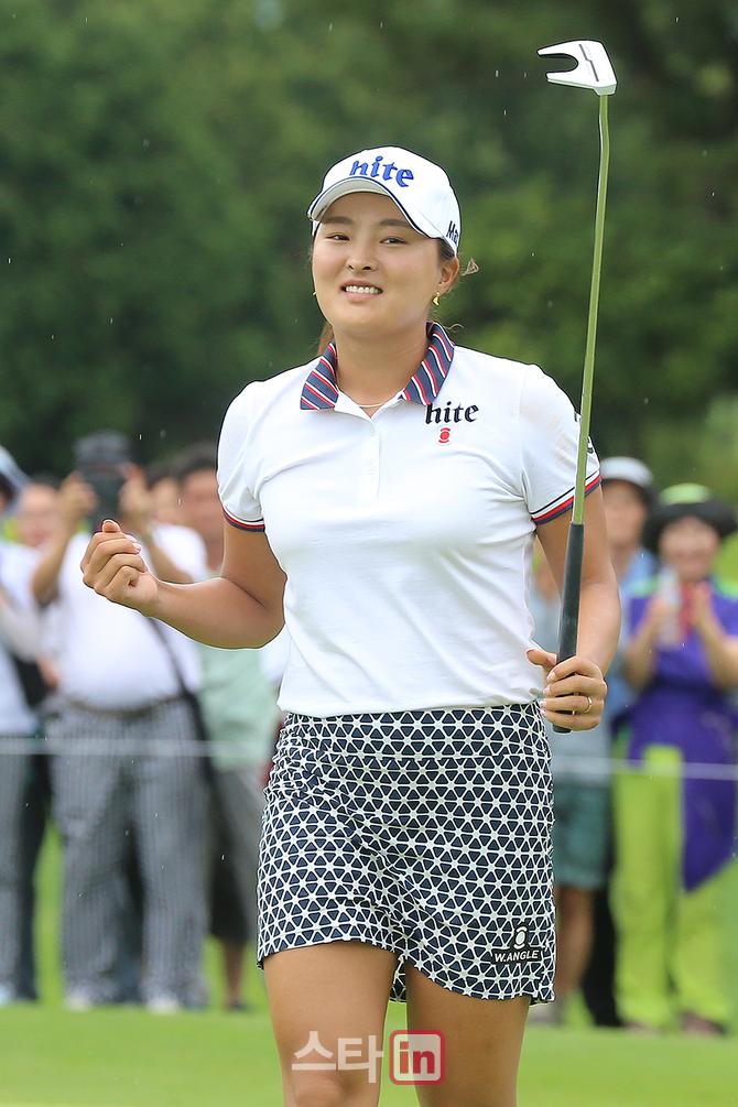 [이데일리 골프in=제주, 박태성기자] 13일 제주시에 위치한 오라 컨트리클럽(파72ㅣ6,545야드)에서 2017 KLPGA 투어 하반기 첫 번째 대회인 '제주 삼다수 마스터스(총상금 6억 원, 우승상금 1억 2천만 원)' 최종라운드가 열린 가운데, 고진영(22.하이트진로)이 오늘 하루 6언더파 합계 17언더파 199타(67-66-66)로 시즌 첫 우승을 차지했다. 통산 8승을 차지했다. 고진영이 18번홀 우승 확정지으며 주먹을 쥐어 보이고 있다.