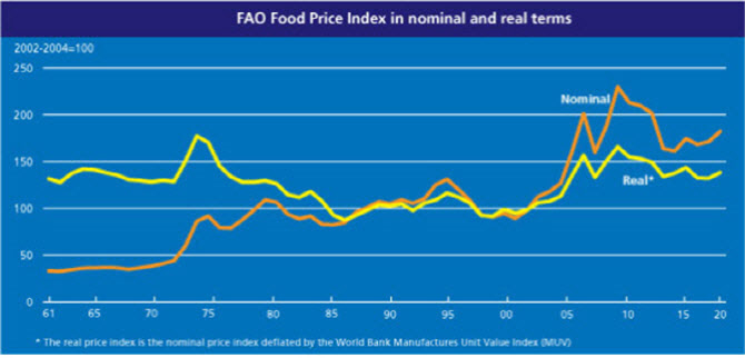 1월 세계식량가격지수는 182.5로 전월대비 0.7%(1.3포인트) 올라 4개월 연속 상승했다. 품목군별로 보면 유지류가 176.3으로 3년만에 최고치를 기록했다. 설탕(220.7)은 5.5%, 곡물(169.2) 2.9%, 유제품(200.6) 0.9% 각각 상승했다.