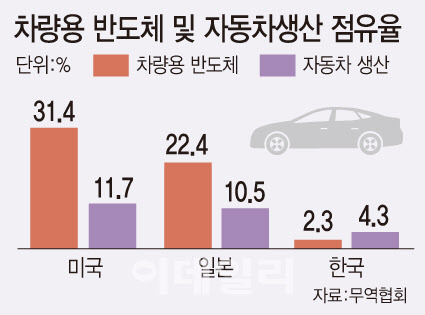 사실 한국은 반도체 강국으로 꼽히나 정확히 말하면 이는 스마트폰·TV·가전 등에 들어가는 ‘메모리’ 반도체에 국한돼 있다. 글로벌 차량용 반도체 시장에서 한국이 차지하는 비중은 2.3% 수준에 불과하다. 차량용 반도체는 고성능 메모리와 비교해 수익성이 떨어지는 데다 제품 사이클·보증 기간이 긴 만큼 제아무리 삼성전자라도 해도 당장 뛰어들긴 쉽지 않다.